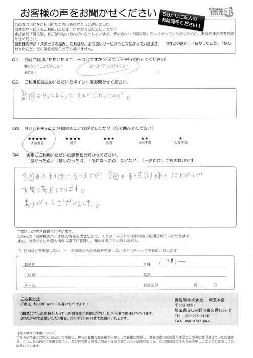何回かお世話になっていますが、作業の丁寧さ、仕上がり、効果の持続性、どれもとても満足しています。
