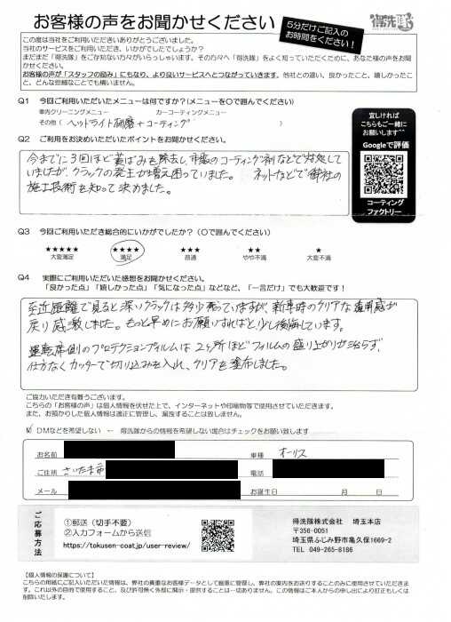 ヘッドライトコーティング 埼玉県さいたま市よりヘッドライトの黄ばみ取りとプロテクションフィルムをご利用いただきました 2020年7月19日 大屋 隆 http://test.tokusen-coat.jp/wp-content/uploads/2018/11/carcoatingfactory_logo.jpg カーコーティング専門店の得洗隊|埼玉・東京・秋田でガラスコーティングならお任せ
