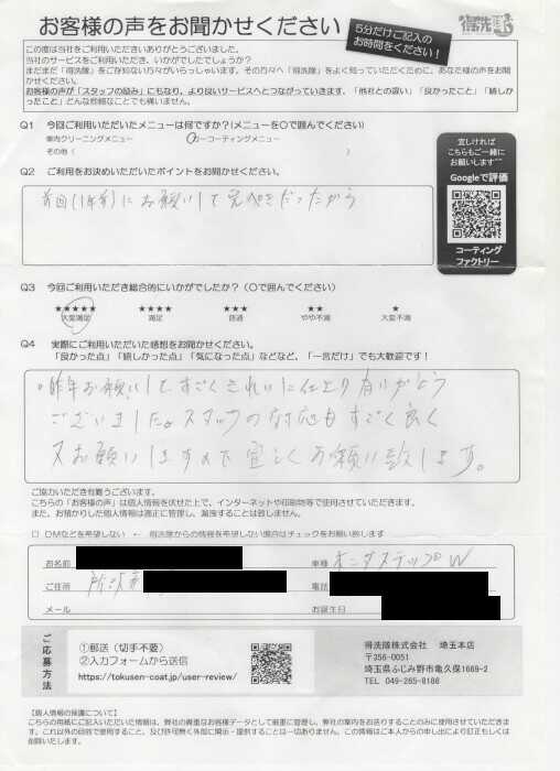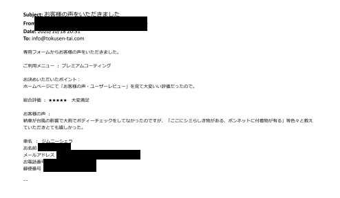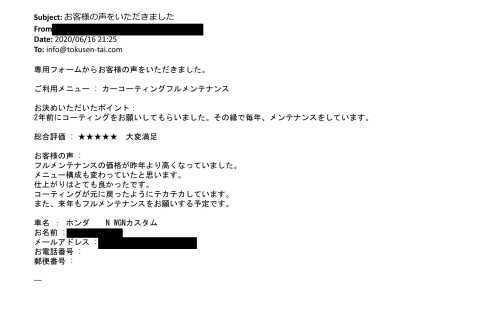 プレミアムコーティング 埼玉県富士見市よりガラスコーティングのメンテナンスでご利用いただきました 2020年10月23日 大屋 隆 http://test.tokusen-coat.jp/wp-content/uploads/2018/11/carcoatingfactory_logo.jpg カーコーティング専門店の得洗隊|埼玉・東京・秋田でガラスコーティングならお任せ